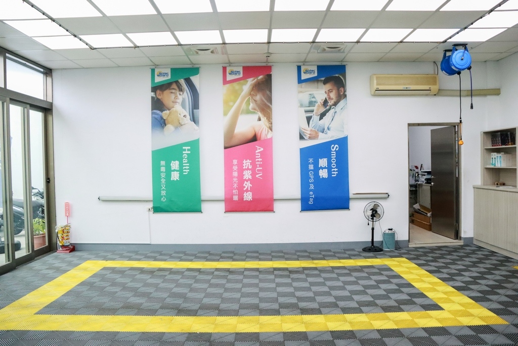 善美德隔熱紙的施作空間,地面有格柵地墊跟上方的噴霧系統,來防止空氣中的灰塵飛到車窗。
