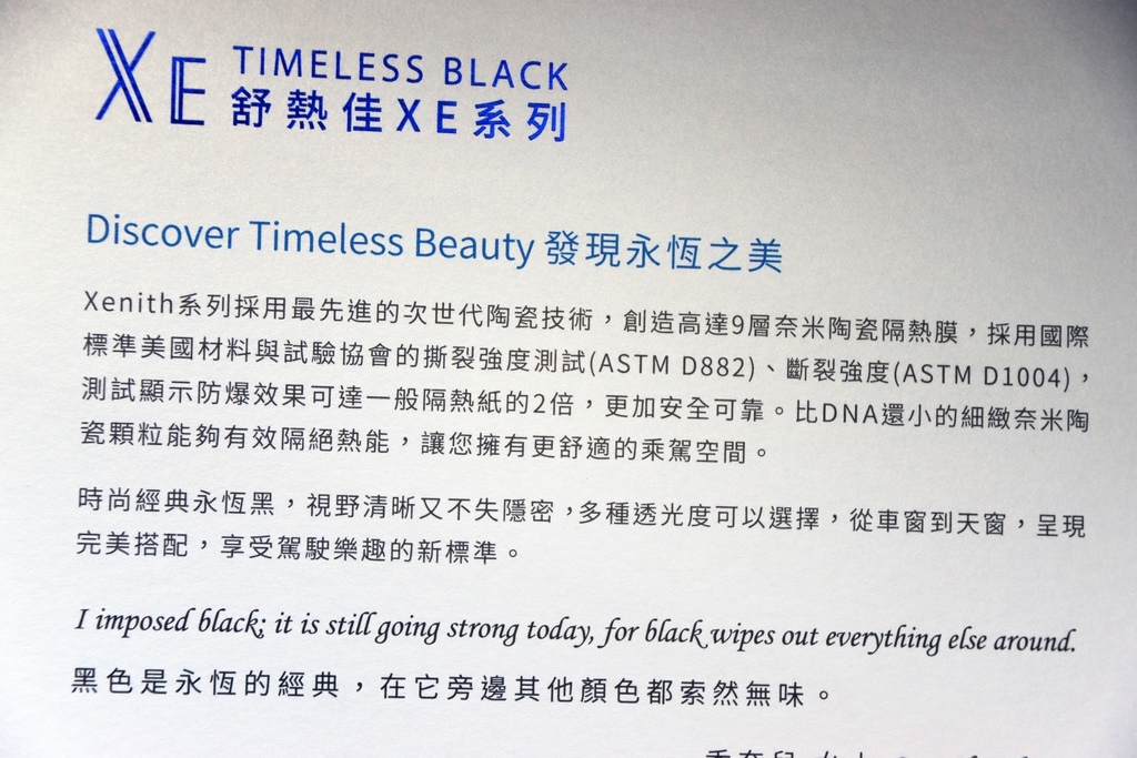 而這次來善美德隔熱紙使用的是舒熱佳XE頂級奈米陶瓷隔熱紙,舒熱佳XE系列有著雙倍膜厚、9層複合結構,兼顧隔熱、安全防護等特色,讓行車的過程更加舒適及安心。