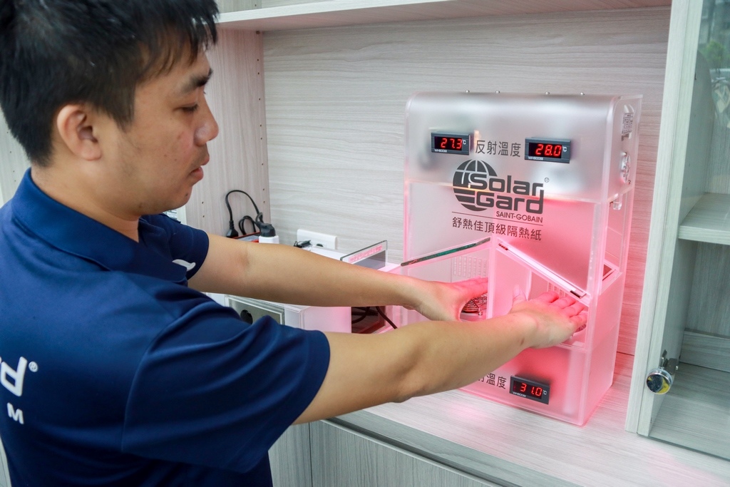 另外當天透過紅外線測試機的實測體驗,舒熱佳隔熱紙的隔熱效果真的非常有感,將雙手伸進去測試機內部,就能明顯感受到溫度的差異!
