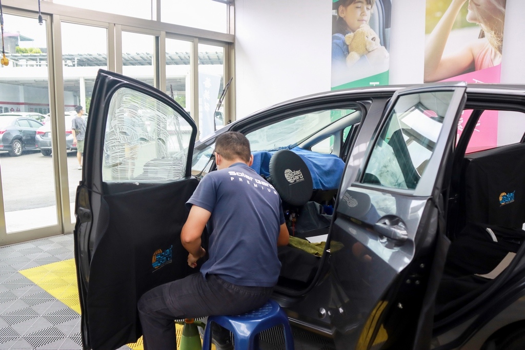 緊接著要來開始貼隔熱紙囉,不過在施作之前會先將車外車內鋪上保護套,在施作過程中不會影響到車子與車主的物品。